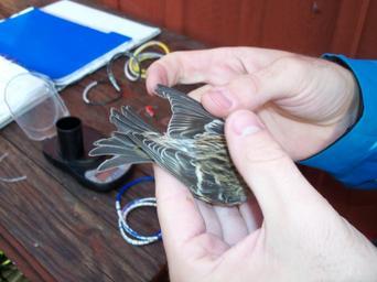 Keywords: Carduelis flammea ringed by Landsort Bird Observatory-5.JPG sv En gråsiska Carduelis flammea antagligen av underarten brunsiska Carduelis flammea cabaret ringmärkt vid Landsorts fyr på Landsorts södra udde på ön Öja syd om Nynäshamn i Södermanland i Stockholms län i Sverige Denna ringmärkning utförs av Landsorts fågelstation en A Common Redpoll Carduelis flammea or probably a Lesser Redpoll Carduelis cabaret ringed at Landsort Lighthouse on the south cape of the island Öja Landsort south of Nynäshamn in Södermanland in Stockholm County in Sweden Landsort Bird Observatory is responsible for the ringing 2010-10-08 own Calandrella cc-zero Uploaded with UploadWizard Unidentified Acanthis Ringed birds Birds being ringed Fringillidae in Sweden Bird migration |