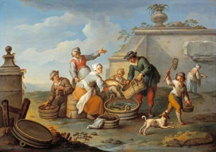 Keywords: Carl Aigen Fischmarkt.jpg Fischmarkt oil on canvas 27 5 × 40 cm Museumsstiftung Post und Telekommunikation Museumsstiftung Post und Telekommunikation Inv Nr 5 2002 418 http //www museumsstiftung de/ museumsstiftung de ~ 1730 Carl Aigen PD-old-100 People with dogs in art Museumsstiftung Post und Telekommunikation Fishmongers in art 1730s paintings Paintings of fish markets Karl Aigen Paintings of people with baskets |