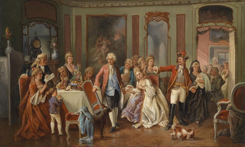 Keywords: Carl Herpfer (circle) Überraschter junger Vater.jpg à berraschter junger Vater im Kreise einer eleganten Gesellschaft Öl auf Leinwand 50 x 81 5 cm http //www dorotheum com Dorotheum century 19 circle of Carl Herpfer 1836-1897 PD-art-100 Images from Dorotheum Carl Herpfer Rococo revival paintings Mothers and children in art |