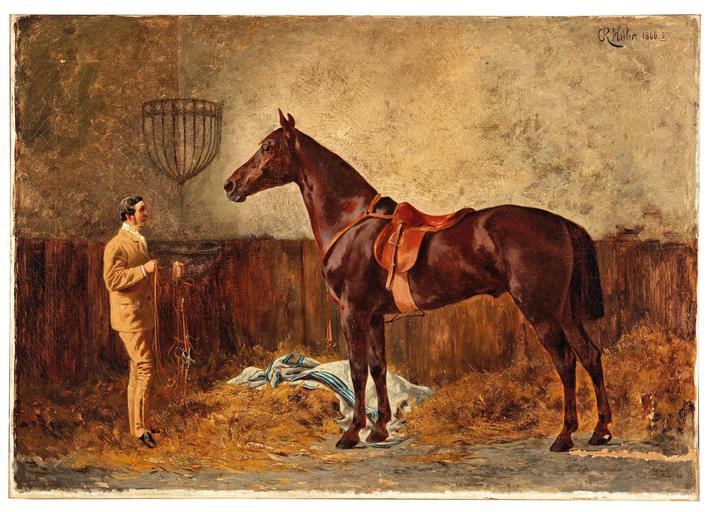 Keywords: Carl Rudolf Huber Vor dem Ausritt 1866.jpg Artwork Creator Carl Rudolf Huber Vor dem Ausritt Before the Ride C R Huber 1866 5 signature/date 1866 Oil on canvas cm 63 89 5 http //www dorotheum com/ PD-old-auto-1923 1896 Images from Dorotheum Carl Rudolf Huber 1866 paintings Paintings of horses Horse stables in art |