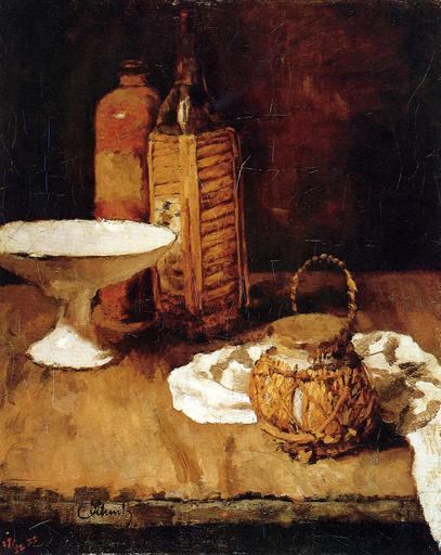 Keywords: Carl Schuch - Fruchtschale, Steingut- und Maraschinoflasche, Ingwerdose und Serviette.jpg Artwork Creator Carl Schuch Gemalt über eine andere Komposition wohl ein querformatiges Stillleben mit Serviette o ä auf einem randparallelem Brett dessen Vorderkante siche von der linken Bildhälfte abzeichnet 1888 Paris oil canvas cm 76 5 62 Museum Wiesbaden accession number object history credit line Still life 20004289609 http //www carlschuch org/tl_files/content/img_25_l jpg www carlschuch org PD-old-100 Still life paintings by Carl Schuch Art Collections of the Museum Wiesbaden 1888 paintings 1880s still-life paintings |