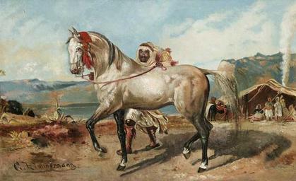 Keywords: Carl Zimmermann - Araber mit Schimmel.jpg vor Zeltlager in Küstenlandschaft oil canvas cm 23 5 39 5 object history credit line accession number http //www auktion-bergmann de/ufItemInfo aspx i_id 257590 a_id 83 ShowTop 100 Auktionshaus Bergmann 2007 03 10 lot 656 PD-old-auto 1930 Carl Zimmermann Orientalist paintings Grey horses in art Images from Auktionshaus Bergmann |