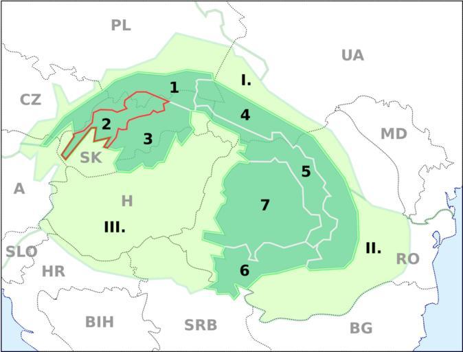 Keywords: Carpathians Western Central.svg Central Western Carpathians outlined in red <br> 1 Outer Western Carpathians <br> 2 Central Western Carpathians <br> 3 Inner Western Carpathians <br> 4 Outer Eastern Carpathians <br> 5 Inner Eastern Carpathians <br>6 Southern Carpathians <br> 7 Apuseni West-Romanian Mountains and Transylvanian Plateau <br> I Subcarpathian depressions <br> II Romanian Lowlands <br> III Pannonian Basin <br>----<br> Centralne Karpaty Zachodnie w czerwonym konturze <br> 1 Zewnętrzne Karpaty Zachodnie <br> 2 Centralne Karpaty Zachodnie <br>3 Wewnętrzne Karpaty Zachodnie <br> 4 Zewnętrzne Karpaty Wschodnie <br> 5 Wewnętrzne Karpaty Wschodnie <br> 6 Karpaty Południowe <br> 7 Góry Zachodniorumuńskie i Wyżyna Transylwańska <br> I Podkarpacie <br> II Równiny Południoworumuńskie <br> III Kotlina Panońska Own PM / P 13 IX 2009 pl Polish language Wikipedia P SVG maps of Europe Maps of the Carpathian Mountains |