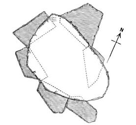 Keywords: Carrowmore Megalithic Cemetery P7 Ground Plan by W. G. Wood-Martin 1886.png Ground plan of P7 by W G Wood-Martin as published in his article The Rude Stone Monuments of Ireland Continued The Journal of the Royal Historical and Archaeological Association of Ireland Fourth Series 7 no 68/69 1886 539 “95 Original caption <br/>Fig 22 ”No 7 Monument Carrowmore Ground Plan of Cromleac Scale 4 fett to 1 inch https //archive org/download/journal02irelgoog/journal02irelgoog pdf p 555 of W G Wood-Martin The Rude Stone Monuments of Ireland Continued The Journal of the Royal Historical and Archaeological Association of Ireland Fourth Series 7 no 68/69 1886 539 “95; this image was extracted from the PDF page number 649 the white background was made transparent and the format was converted to PNG 1886 William Gregory Wood-Martin 1847 “1917 see http //catalogue nli ie/Record/vtls000132150 NLI record PD-old-auto-1923 1917 Carrowmore Megalithic Cemetery P7 Megaliths diagrams |