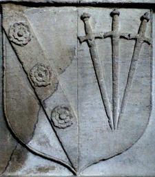 | Keywords: CaryImpalingPoulett 1586 ClovellyChurch Devon.PNG en Detail from monument to Robert Cary d 1586 of Clovelly Devon South wall of chancel All Saints Church Clovelly On the base of the north side are shown two relief sculpted heraldic escutcheons this one showing Cary impaling Sable three swords pilewise points in base proper pomels and hilts or Poulett for his grandfather Sir William I Cary 1437-1471 of Cockington who married Elizabeth Poulett a daughter of Sir William Poulett of Hinton St George Somerset ancestor of Earl Poulett own photo Lobsterthermidor <span class signature-talk ></span> 19 10 27 December 2015 UTC Sculpture 1586; photo 2014 All Saints Church Clovelly interior Cary arms Poulett arms |