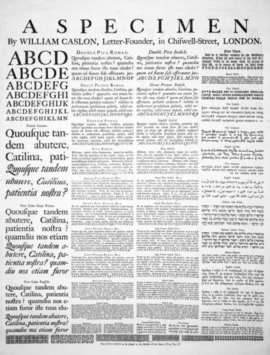 Keywords: Caslon-schriftmusterblatt (cleaned).jpeg A specimen sheet of typefaces and languages by William Caslon I letter founder; from the 1728 en Cyclopaedia Schriftmusterblatt der Schriftgiesserei von William Caslon http //images library wisc edu/HistSciTech/EFacs/Cyclopaedia/Cyclopaedia02/XL/0089 jpg uploaded to the English Wikipedia by Janke as Image Caslonsample jpg probably deleted soon 16 26 23 March 2006 1728 or earlier William Caslon PD <gallery> File Caslon-schriftmusterblatt jpeg Originalv ersion </gallery> Derivative work This image has been cleaned from File Caslon-schriftmusterblatt jpeg by Notwist Cleaning operations Black and white Contrast and brightness altered Some spots removed with clone stamp PD-old-100 Sample texts used Most of the texts have typographical errors preserved in their transcriptions here Square brackets contain differences between multiple occurences of the same sample text ; Latin text Ciceronis Oratio in Catilinam Prima; §§ 1 3 5 7 9 <sup> at wikisource </sup> Quousque tandem abutêre Catilina patientia nostra quamdiu nos etiam furor iste tuus eludet quem ad finem sese effrenata jactabit audacia nihilne te nocturnum præsidium palatii nihil urbis vigiliæ nihil timor populi nihil consensus bonorum omnium nihil hic munitissimus habendi se- Melium novis rebus studentem manu sua occîdit Fuit fuit ista quondam in hac repub virtus ut viri fortes acrioribus suppliciis civem perniciosum quam acerbissimum hostem coërcerent Habemus enim senatusconsultum in te Catilina vehemens grave non deest reip consilium neque autoritas hujus ordinis nos nos dico aperte consules desumus Decrevit quondam senatus At nos vigesimum jam diem patimur hebescere aciem horum autoritatis habemus enim hujusmodi senatusconsultum verumtamen inclusum in tabulis tanquam gladium in vagina reconditum quo ex senatusconsulto confestim interfectum te esse Catilina convenit Vivis vivis non ad deponendam sed ad confirmandam audaciam Cupio P C me esse clementem cupio in tantis reipub periculis non dissolutum videri sed jam meipsum inertiæ Verum ego hoc quod jampridem factum esse oportuit certa de caussa nondum adducor ut faciam tum denique interficiam te cum jam nemo tam improbus tam perditus tam tui similis inveniri poterit qui id non jure factum esse fateatur Quamdiu quisquam erit qui te defendere audeat vives vives ita ut nunc vivis multis meis firmis præsidiis obsessus ne commovere te contra rempub possis multorum te etiam oculi aures non sentientem sicut adhuc fecerunt speculabuntur atque custodient Etenim quid est Catilina quod jam amplius exspectes Novemb C Manlium audaciæ satellitem atque administrum tuæ num me fefellit Catilina non modo res tanta tam atrox tam incredibilis verum id quod multo magis est admirandum dies Dixi ego idem in senatu cædem te optimatum contulisse in ante diem v Kalend Novemb tum cum multi principes civitatis Rom non tam sui conservandi quam tuorum consiliorum reprimendorum caussa profugerunt num inficiari potes te illo ipso die meis præsidiis mea diligentia circumclusum commovere te contra rempub non potuisse; cum tu discessu ceterorum nostra tamen qui remansissemus cæde contentum te esse dicebas Quid cum te Præneste Kalend ipsis Novembris occupaturum nocturno O dii immortales ubi-nam gentium sumus quam rempub habemus in qua urbe vivimus hic hic sunt in nostro numero P C in hoc orbis terræ sanctissimo gravissimoque consilio qui de meo nostrumque omnium interitu qui de hujus urbis atque adeo orbis terrarum exitio cogitent hosce ego video consul de republica sententiam rogo quos ferro trucidari oportebat eos nondum voce vulnero Fuisti igitur apud Leccam ea nocte Catilina distribuisti partes Italiæ statuisti quo quemque proficisci placeret delegisti quos Romæ relinqueres quos tecum educeres descripsisti urbis partes ad incendia confirmasti te ipsum jam esse exiturum dixisti paululum tibi esse etiam tum moræ quod ego viverem Reperti sunt duo equites Romani qui te ista cura liberarent sese illa ipsa nocte paulo ante lucem me in meo lectulo interfecturos pollicerentur Hæc ego omnia vix dum etiam coetu vestro dimisso comperi domum meam majoribus præsidiis munivi atque firmavi exclusi eos quos tu mane ad me salutatum miseras cum illi ipsi venissent ; Saxon text Old English version of Venerabilis Baedae Historia ecclesiastica gentis Anglorum; book I §7 <sup> reference </sup> Ða he da mid grimmum fwinglum tintregum wæced wæs he ealle þa witu ðe him man dyde geþyldelice gefeonde sor dritne abær ar ; English text not identified And be it further enacted by the Authority aforesaid That all and every of the said Exchequer Bills to be made forth by virtue of this Act or so many of them as shall from time to time remain undischarged and uncancelled until the discharging and cancelling the same pursuant to this Act ; Gothic text First verse of the Lord's Prayer <sup> at wikisource </sup> 𐌰𐍄𐍄𐌰 𐌿𐌽𐍃𐌰𐍂 𐌸𐌿 𐌹𐌽 𐌷𐌹𐌼𐌹𐌽𐌰𐌼 𐍅𐌴𐌹𐌷𐌽𐌰𐌹 𐌽𐌰𐌼𐍉 𐌸𐌴𐌹𐌽 𐌵𐌹𐌼𐌰𐌹 𐌸𐌹𐌿𐌳𐌹𐌽𐌰𐍃𐍃𐌿𐍃 𐌸𐌴𐌹𐌽𐍃 𐍅𐌰𐌹𐍂𐌸𐌰𐌹 𐍅𐌹𐌰𐌾𐌰 𐌸𐌴𐌹𐌽𐍃 𐍃𐍅𐌴 𐌹𐌽 𐌷𐌹𐌼𐌹𐌽𐌰 ; Coptic text Genesis 1 1 3 <sup> http //www moheb de/Bible_books html at external site </sup> unified Greek and Coptic characters Ϧεη ουαρχη ὰφϯ θαμὸ ν τφε νεμ καϩι ικαϩι δε νε ουαθναυ ὲροϥ ε ουοϩ ν ατσοβϯ ουχακι ναϥχη εϫεν φνουν ουοϩ ου ͞ν͞α ν τεφϯ ναϥνηου ϩιϫεν νι ωου ο- disunified Coptic characters Ϧ ϯ ϩ ϩ ϥ ϩ ϯ ϥ ϫ ϩ ͞ ͞ ϯ ϥ ϩ ϫ - ; Armenian text Mosis Chorenensis Historia Armeniaca; book I §9 <sup> http //titus uni-frankfurt de/texte/etcs/arm/mokhor/mokho010 htm at external site </sup> Ա շակ Թագաւո ե կ ի և ծովու ո ոյ անձն և պատկե ո պէս և է իսկ մ