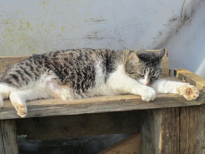 Keywords: cat animal concerns nature wood mackerel outstretched tired sleepy