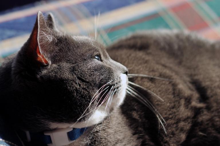 Keywords: cat chubby cheek whiskers kitty fur domestic adorable cute fat furry gray short hair feline lazy pet animal nose relax tired