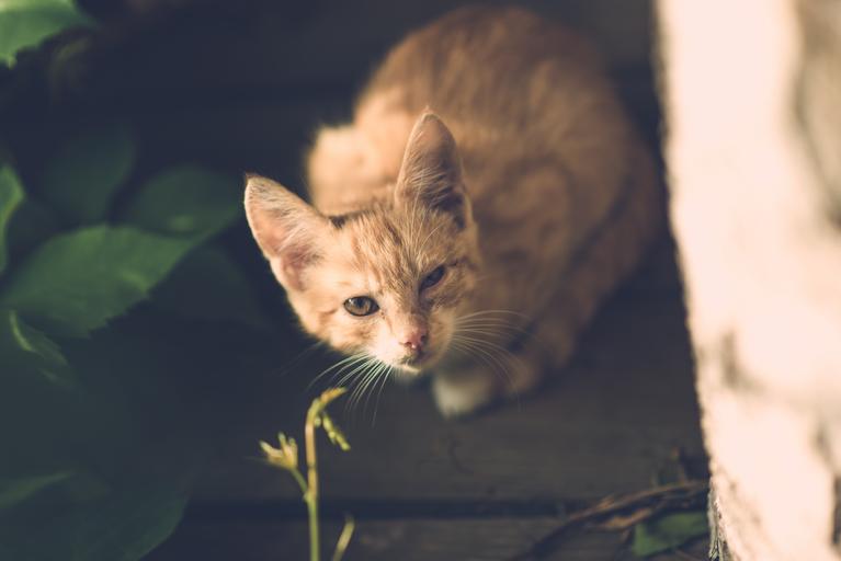 Keywords: cat eye injury one eye village illness vintage wooden outdoor animal pet cute young little unhappy small family domestic red fur portrait nature garden poor