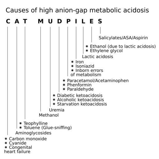 Keywords: Cat mudpiles - causes of high anion-gap metabolic acidosis.svg en Causes of high anion-gap metabolic acidosis Mnemonic CAT MUDPILES Carbon monoxide Cyanide Congenital heart failure Aminoglycosides Teophylline Toluene Glue-sniffing Methanol Uremia Diabetic ketoacidosis Alcoholic ketoacidosis Starvation ketoacidosis Paracetamol/Acetaminophen Phenformin Paraldehyde Iron Isoniazid Inborn errors of metabolism Lactic acidosis Ethanol due to lactic acidosis Ethylene glycol Salicylates/ASA/Aspirin 2014-08-26 09 42 19 own Savvas Radevic cc-zero Uploaded with UploadWizard Mnemonic Medicine Metabolic diseases and disorders Pathophysiology Etiology |