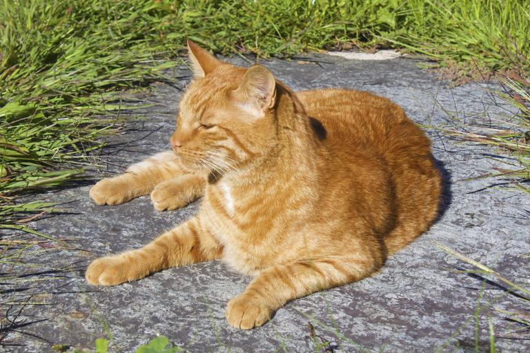 Keywords: cat red pet fur cute domestic ginger striped relax laying grass