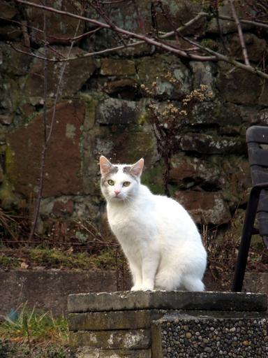 Keywords: cat wall white animal eyes green sitting nature watch pet vigilant grey brown autumn