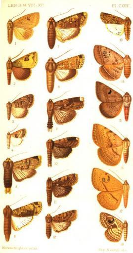 Keywords: CATALOGUE-BM-PLATE CCIII.jpg en PLATE CCIII 1 Herminiocala pallida f Vol XII p 235 Costa Rica syn Rhosologia pallida Herminocala pallida Herminocala pallidoides 2 H atomosa m p 236 Costa Rica 3 Hypotacha nigristria f p 244 Cape Colony 4 Crypsotidia conifera m p 249 Br C Africa 5 Acanthodica cabra m p 252 Ecuador 6 A hages m p 252 Colombia 7 A grandis f p 253 Mexico 8 A emittens f p 254 Jamaica 9 A drucei m p 255 Ecuador 10 A lignaris m p 255 Brazil 11 A fosteri m p 256 Paraguay 12 A xylinoides m p 257 Brazil 13 A chiripa m p 258 Ecuador 14 Enmonodia carneotincta f p 340 Bechuanaland 15 E burmanica m p 342 Burma 16 E burmanica f p 342 Burma 17 Speiredonia griseisigna m p 348 Mashonaland Spirama griseisigma 18 Calliodes appollina m p 344 Abyssinia CATALOGUE OF THE NOCTUIDAE IN THE COLLECTION OF THE BRITISH MUSEUM Sir GEORGE F HAMPSON Bart 1903-1913 Acanthodica cabra JPG Acanthodica chiripa JPG Acanthodica drucei JPG Acanthodica emittens JPG Acanthodica fosteri JPG Acanthodica grandis JPG Acanthodica hages JPG Acanthodica lignaris JPG Acanthodica xylinoides JPG Calliodes appollina JPG Crypsotidia conifera JPG Enmonodia burmanica female JPG Enmonodia burmanica male JPG Enmonodia carneotincta JPG Herminocala atomosa JPG Herminocala pallidoides JPG Hypotacha nigristria JPG Spirama griseisigma JPG PD-old Catalogue of Lepidoptera Phalaenae in the British Museum Vol 4 |