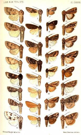 Keywords: CATALOGUE-BM-PLATE CXXVII.jpg en PLATE CXXVII 1 Acronycta hesperida f Vol VIII p 152 Manitoba H9204 Acronicta hesperida Sm 1897 2 A dactylina m p 154 New York H9203 Acronicta dactylina Grt 1874 3 A insita f p 155 Ontario H9202 Acronicta insita Wlk 1856 4 A innotata m p 155 New York H9207 Acronicta innotata Gn 1852 5 A othello m p 156 California H9270 Acronicta othello Sm 1908 6 A longa m p 157 New York H9264 Acronicta longa Gn 1852 7 A sperata m p 157 Massachusetts H9258 Acronicta sperata Grt 1873 8 A cretata f p 160 Colorado H9205 Acronicta lepusculina Gn 1852 9 Eulonche lanceolaria f p 164 Massachusetts H9274 Acronicta lanceolaria Grt 1875 10 E insolita m p 164 Pennsylvania H9272 Acronicta oblinita J E Smith 1797 11 Merolonche lupini m p 165 California H9275 Grt 1873 12 M ursina f p 166 Colorado H9279 Sm 1898 13 Simyra henrici m p 176 Canada H9280 Grt 1873 14 S colorada m p 177 Colorado H 15 S albicosta f p 178 Madras 16 S conspersa m p 179 Bengal 17 Calophasidia dentifera f p 182 W Australia 18 Matopo nigrivittata m p 185 Mashonaland 19 M inangulata m p 186 Rhodesia 20 M actinophora m p 187 Br E Africa 21 M hemileuca f p 189 S Leone 22 Delta goniosema f p 191 Mexico 23 D ramosula m p 193 New York H9582 Nedra ramosula Gn 1852 24 D steuarti f p 193 California H9583 Nedra stewarti Grt 1875 25 D campyla m p 194 S Leone 26 D gnorima m p 195 W Turkestan 27 D detersina m p 196 W Turkestan 28 D indica m p 196 Punjab 29 D albiclava m p 198 Peru 30 Andropolia illepida m p 200 Colorado H9563 A diversilineata Grt 1877 31 A pulverulenta m p 201 Alberta H9564 A contacta Wlk 1856 a pulverulenta Sm 1891 32 A pallifera f p 202 Illinois H9565 Grt 1877 CATALOGUE OF THE NOCTUIDAE IN THE COLLECTION OF THE BRITISH MUSEUM Sir GEORGE F HAMPSON Bart 1903-1913 Acronicta dactylina JPG Acronicta hesperida JPG Acronicta innotata JPG Acronicta insita JPG Acronicta lanceolaria2 JPG Acronicta lepusculina12 JPG Acronicta longa JPG Acronicta oblinita2 JPG Acronicta othello JPG Acronicta sperata JPG Andropolia contacta JPG Andropolia diversilineata JPG Andropolia pallifera JPG Calophasidia dentifera JPG Delta albiclava JPG Delta campyla JPG Delta detersina JPG Delta gnorima JPG Delta goniosema JPG Delta indica JPG Matopo actinophora JPG Matopo hemileuca JPG Matopo inangulata JPG Matopo nigrivittata JPG Merolonche lupini JPG Merolonche ursina JPG Nedra ramosula JPG Nedra stewarti JPG Simyra albicosta JPG Simyra colorada JPG Simyra conspersa JPG Simyra henrici JPG PD-old Catalogue of Lepidoptera Phalaenae in the British Museum Vol 4 |