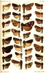 | Keywords: CATALOGUE-BM-PLATE LXX.jpg  en PLATE LXX 1 Agrotis degenerata m Vol IV p 391 W Turkestan 2 A deraiota m p 391 Ceylon 3 A mysteca f p 393 Mexico 4 A atritegulata m p 394 Transvaal 5 A mandarina f p 394 W China 6 A renalis m p 395 Punjab 7 A consanguinea m p 396 Punjab 8 A costaestriga m p 396 Tibet 9 A bicarnea m p 397 Canada H10950 Xestia bicarnea Gn 1852 10 A treati m p 398 Massachusetts H10951 Xestia tenuicula Morr 1874 11 A normaniana m p 398 Canada H10943 Xestia normaniana Grt 1874 12 A collari m p 399 Siberia 13 A conchis f p 401 Colorado H10946 Xestia conchis Grt 1879 14 A junctura m p 402 Punjab 15 A vibora; m p 404 Ecuador 16 A repleta m p 408 Mexico 17 A crinigera m p 409 Hawaii 18 A compta m p 409 N S Wales 19 A herculeana f p 410 Mexico 20 A bolteri f p 414 New Mexico H10941 Xestia bolteri Sm 1898 21 A neurogramma m p 415 Hawaii 22 A rosaria m p 416 California H10921 Diarsia rosaria Grt 1878 23 A calgary m p 417 Canada H10921 Diarsia calgary Sm 1898 24 A plebeia m p 417 Br Columbia H11011 Hemigraphiphora plebeia Sm 1898 25 A mandarinella m p 418 W China 26 A jucunda f p 418 Canada H10919 Diarsia jucunda Wlk 1857 27 A rubifera m p 420 New York H10917 Diarsia rubifera Grt 1875 28 A phyllophora m p 421 New York H11010 Heptagrotis phyllophora Grt 1874 29 A nebula f p 422 W China 30 A flavibrunnea m p 422 W China 3l A tarda f p 424 Japan 32 A cinctipennis f p 424 Hawaii CATALOGUE OF THE NOCTUIDAE IN THE COLLECTION OF THE BRITISH MUSEUM Sir GEORGE F HAMPSON Bart 1903-1913 <gallery> File CLBM 04 Pl70 png Larger version </gallery> PD-old Catalogue of Lepidoptera Phalaenae in the British Museum Vol 4  |
