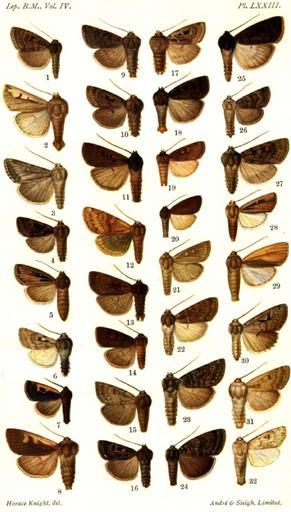 Keywords: CATALOGUE-BM-PLATE LXXIII.jpg en PLATE LXXIII 1 Euxoa marcida m Vol IV p 322 Persia 2 E t-nigrum m p 323 Brazil 3 E aequicuspis m p 334 Mongolia 4 Episilia panda m p 486 W China 5 E bistrigata f p 487 Ecuador 6 E terrifica m p 487 Colorado H10900 Protogygia elevata Sm 1891 7 E retracta m p 489 Sikhim 8 E flavicosta f p 489 Patagonia 9 E fishi f p 490 Maine H10997 Metalepsis fishii Grt 1878 10 E cinerea m p 490 Labrador H10939 Pachnobia okakensis Pack 1867 11 E ceramophaea m p 492 Hawaii 12 E loresi m p 492 Tirol 13 E destituta m p 493 W China 14 E homochroma m p 493 Tibet 15 E cinerascens m p 494 Washington H10949 Xestia cinerascens Sm 1891 16 E stridula m p 498 W Turkestan 17 E voccei m p 498 New Hampshire H10937 Pachnobia wockei Mosch 1862 18 E praecipua m p 499 E Siberia 19 E modesta m p 501 Tibet 20 E isochroma m p 502 Tibet 21 E argillacea m p 502 Tibet 22 E violetta m p 502 W Turkestan 23 E alaina m p 503 W Turkestan 24 E ignobilis m p 506 W Turkestan 25 E subplumbea m p 507 Tibet 26 E diplogramma m p 508 W Turkestan 27 E monogramma m p 509 Kashmir 28 E tiniloides f p 512 Ecuador 29 E amina f p 513 Ecuador 30 Lycophotia perigrapha m p 516 Tibet 31 L lutescens m p 517 Urals 32 L achromatica m p 518 Brazil CATALOGUE OF THE NOCTUIDAE IN THE COLLECTION OF THE BRITISH MUSEUM Sir GEORGE F HAMPSON Bart 1903-1913 <gallery> File CLBM 04 Pl73 png Larger version </gallery> PD-old Catalogue of Lepidoptera Phalaenae in the British Museum Vol 4 |