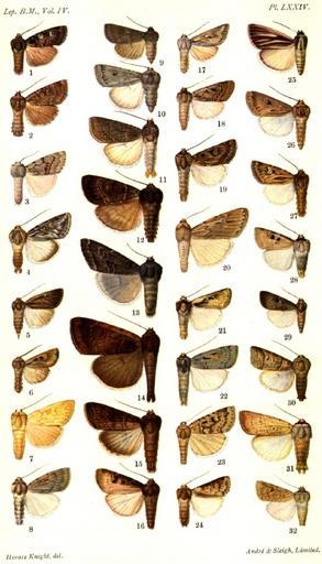Keywords: CATALOGUE-BM-PLATE LXXIV.jpg en PLATE LXXIV 1 Lycophotia sichima m Vol IV p 519 Sikhim 2 L erschoffi m p 521 W Turkestan 3 L planifrons m p 522 Br Columbia H10974 Setagrotis planifrons Sm 1890 4 L fidelis m p 522 Portugal 5 L radiola f p 523 California H10976 Setagrotis radiatus Sm 1900 6 L mendosica m p 524 Argentina 7 L ochrina m p 526 Syria 8 L congrua m p 529 Oregon H10976 Setagrotis cinereicollis Grt 1876 9 L quebecensis f p 530 Canada H10714 Euxoa Pleonectopoda quebecensis Sm 1900 10 L elata m p 530 Colorado H10715 Euxoa Pleonectopoda scandens Riley 1869 11 L cuprina m p 531 W Turkestan 12 L astricta m p 531 New York H10930 Eurois astricta Morr 1874 13 L nigra m p 532 Colorado H10931 Eurois nigra Sm 1892 14 L denticulata m p 533 Punjab 15 L ochronota m p 535 Uruguay 16 L semifusca m p 535 Chili 17 L demutabilis f p 537 Arizona H10899 Protogygia biclavis Grt 1879 18 L vocalis m p 538 Colorado H10975 Setagrotis cinereicollis Grt 1876 a vocalis Grt 1879 19 L eminens m p 538 W Turkestan 20 L grandipennis m p 540 New Mexico H10890 Pseudoseptis grandipennis Grt 1883 21 L rudens m p 541 Texas H10914 Hemieuxoa rudens Harv 1875 22 L tamerlana m p 541 W Turkestan 23 L juncei m p 542 W Turkestan 24 L pellucidalis m p 542 Texas H10914 Hemieuxoa rudens Harv 1875 25 L radiata f p 514 Brazil 26 L truculenta m p 549 W Siberia 27 L toxistigma m p 549 Syria 28 L bitriangula m p 553 Cape Colony 29 L isopleura f p 553 Mashonaland 30 L orthgramma m p 554 Brazil 31 L ignicans m p 554 Mexico 32 L biformis m p 556 Brazil CATALOGUE OF THE NOCTUIDAE IN THE COLLECTION OF THE BRITISH MUSEUM Sir GEORGE F HAMPSON Bart 1903-1913 PD-old Catalogue of Lepidoptera Phalaenae in the British Museum Vol 4 |