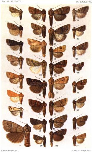 Keywords: CATALOGUE-BM-PLATE LXXXVII.jpg en PLATE LXXXVII 1 Eriopypa ochrota m Vol V p 300 Mexico 2 E planalis m p 301 New Mexico H10595 Hexorthodes planalis Grt 1883 3 E agrotiformis f p 302 Colorado H10596 Hexorthodes agrotiformis Grt 1881 4 E perforata m p 302 Arizona H10595 Protorthodes perforata Grt 1883 5 E culea m p 304 Florida H10567 Ulolonche culea Gn 1852 6 E consopita f p 305 Arizona H10568 Ulolonche consopita Grt 1881 7 E diplogramma m p 305 Mexico 8 E curvata m p 308 Corea 9 E secedens f p 312 Brazil 10 E excavata f p 312 Brazil 11 E flavigera m p 315 Costa Rica 12 E carneigera m p 317 Brazil 13 E orbica m p 318 Mexico 14 E lanaris m p 319 Mexico 15 E moderata f p 319 Colombia 16 E jamaicensis m p 321 Jamaica 17 E niveipuncta f p 325 Panama 18 E melanosticta m p 326 Paraguay 19 E nigripars m p 327 Costa Rica 20 E janeira m p 329 Brazil 21 E punctula m p 329 Brazil 22 E glaucistis m p 331 Brazil 23 E azucara f p 331 Brazil 24 E mesostrigata m p 333 Guatemala 25 E intractata m p 335 U S A H10502 Himella intractata Morr 1874 26 E goniostigma m p 335 Mexico 27 E violascens f p 340 Mexico 28 E ropilla m p 34l Ecuador 29 E irrorata m p 341 Washington H10582 Pseudorthodes irrorata Sm 1888 30 E virgula m p 342 New Mexico H10584 Pseudorthodes virgula Grt 1883 31 E pyropis m p 342 Costa Rica 32 E iole m p 343 Guatemala CATALOGUE OF THE NOCTUIDAE IN THE COLLECTION OF THE BRITISH MUSEUM Sir GEORGE F HAMPSON Bart 1903-1913 PD-old Catalogue of Lepidoptera Phalaenae in the British Museum Vol 4 |