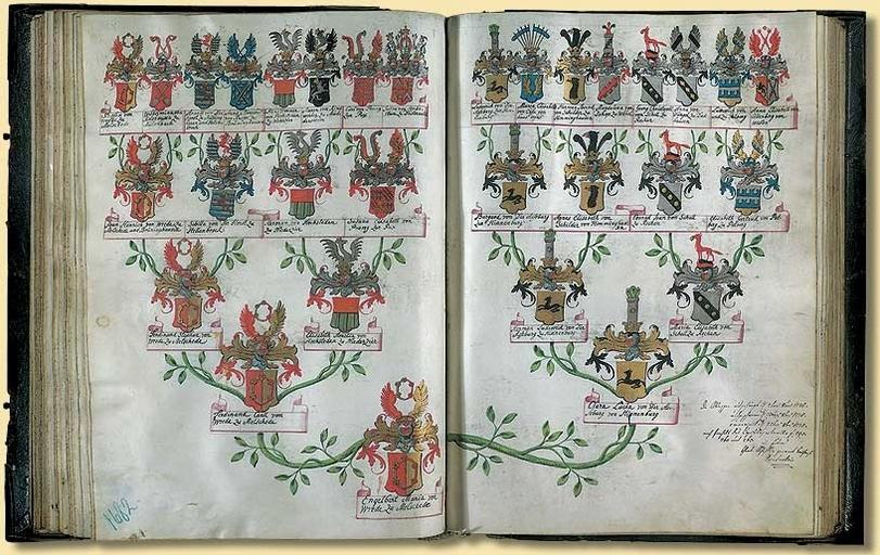 Keywords: Cathedral Chapter armorial Münster.jpg en Armorial containing the Aufschwörungstafel proof of nobility submitted by one Engelbert Maria von Wrede zu Melschede 1742-1808 to the Domkapitel cathedral chapter of the Prince-Bishopric of Münster in 1775 <br> In the Holy Roman Empire a candidate to a prebend a canonship on most cathedral chapters had to prove he possessed a minimum number of quarters of nobility usually 16 spread over the previous four generations Here von Wrede could prove he possessed 30 such quarters of nobility There were 41 canons in Münster and membership was by co-option as in nearly all the other prince-bishoprics of the Holy Roman Empire 2014-07-16 08 48 34 http //genwiki genealogy net/Aufschw C3 B6rung Photograph from the State Archives of Münster Staatsarchiv Münster Original over 200 years old PD-old-100 Uploaded with UploadWizard Prince-Bishopric of Münster Cathedral Chapter 2014 in Münster |