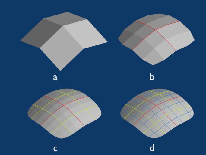 Keywords: Catmull-Clark subdivision of 4 planes.png th a mesh ริ่มต้น b subdivide ด้วย algorithm Catmull-Clark ที่ level 1 c ที่ level 2 และ d ที่ level 3 งานของ ู้อัปโหลด อง own work by uploader Banlu Kemiyatorn 2009-02-04 Subdivision surfaces
