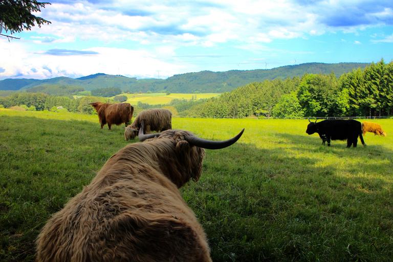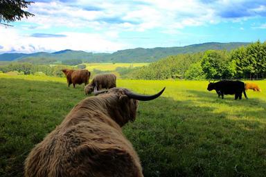 Keywords: cattle cows highland beef scotland black forest horns pasture grass landscape trees forest animals graze summer shaggy cops