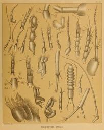 Keywords: Cave Fauna of North America Plate 03.jpg en Plate III Fig 1 Caecidotea stygia Pack Drawn by J S Kingsley from a specimen exactly like one from Mammoth Cave; the details drawn from a Mammoth Cave specimen la larger antenna ; 1b cercopod 2 ; lc cercopod J 1 ; Id one of the terminal setae much larger than the others and bulbous at the end Fig 2a C stygia ” Antennule of short form from the Labyrinth Mammoth Cave ; 26 end of 2a with the three olfac- tory rods; 2c 9 antennule ; ol olfactory rods; 2d the same enlarged showing the four terminal joints filled with nerve cells n cells and the auditory bristle and s ; 2e first maxilla of authors ; 2/ the same enlarged the outer lobe bearing ten or eleven 6imple setae the inner lobe five spinulated setae ; 2g second maxilla of authors ; 2ft end of same enlarged each of the two outer lobes bearing on the inner edge six or seven curious comb like setae not very well represented in the plate the other setae transversely stri- ated; 2i the second pair of appendages behind the mandibles first maxilla Fig 3 3a C stygia Forbes from a well in Illinois ” Second joint of antennule with three auditory bristles ; 3a' three basal joints of antennule from a Mammoth Cave individual with an auditory bristle on the basal and two on the second joint Fig 4 C stygia from Annville Pennsylvania ” Antennule of seventeen joints ” 4a end of the same with six olfactory rods three of which are on the sixth joint from the end Fig 5 C stygia from Long Cave ” Antennule ; 5a antennule of another individual from the same cave with but eight joints; 5b 5c antennae of the same; bd a leg of the first pair 2 adult with eggs Fig 6 C stygia collected in daylight 50 feet in from entrance of Walnut Hill Spring Cave attennule; 6a terminal joints of the same Fig 7 C stygia from Bradford Cave ” Antennule of ten to eleven joints Fig 8 C stygia from Carter X Cave ” 8a terminal joints of the antennule with five olfactory rods Fig 9 C nickajackensis ” Antennule; 9a terminal joints All the figures except one drawn by the author 1888 Packard A S 1888 https //archive org/details/cavefaunaofnorth00pack The cave fauna of North America with remarks on the anatomy of the brain and origin of the blind species Washington National Academy of Sciences Alpheus Spring Packard other versions PD-old-70-1923 The Cave Fauna of North America Uploaded with UploadWizard Caecidotea stygia |