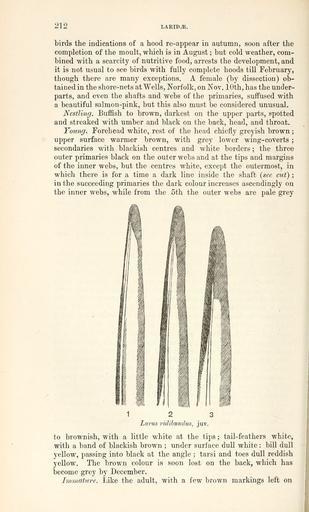 Keywords: CBBM25 212.png Larus ridibundus <small>L </small> Chroicocephalus ridibundus <small> Linnaeus 1766 </small> juv Common Black-headed Gull juvenile wingtip pattern from below Catalogue of the birds in the British Museum http //www archive org/details/catalogueofbirds25brit Vol 25 Page 212 1896 Howard Saunders Osbert Salvin text PD-old CBBM25 Chroicocephalus ridibundus illustrations Feathers of Chroicocephalus |