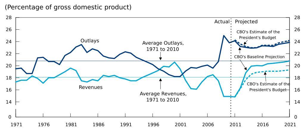 | Keywords: CBO - Revenues and Outlays as percent GDP.svg Total revenues and outlays under CBO's March 2011 baseline and CBO ™s estimate of the president ™s budget http //www cbo gov/publication/22087 An Analysis of the President's Budgetary Proposals for Fiscal Year 2012 http //www cbo gov/sites/default/files/cbofiles/ftpdocs/121xx/doc12130/04-15-analysispresidentsbudget pdf PDF Fig 1-2 p 8 2011-04-15 Congressional Budget Office PD-USGov Budget charts SVG charts in English Economic line charts Government debt-to-GDP ratio of the United States United States federal budget |