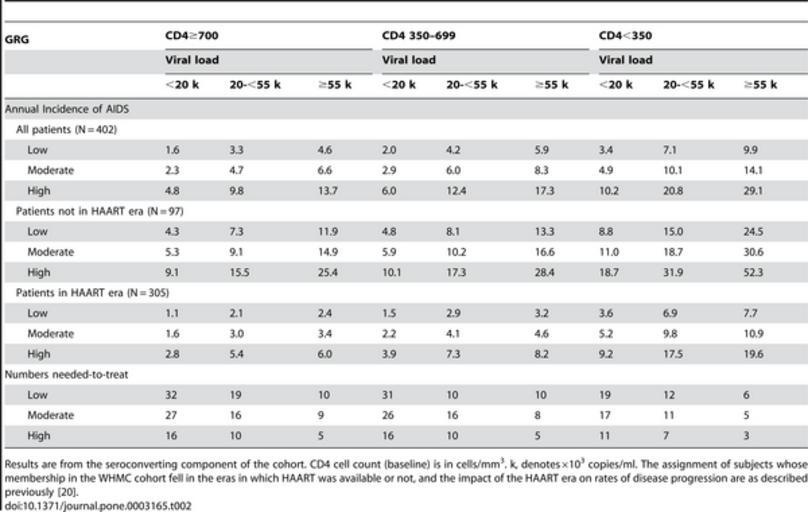 | Keywords: CCL3L1-CCR5 Genotype Improves the Assessment of AIDS Risk in HIV-1-Infected Individuals - Table two.png Annual incidence of AIDS and numbers needed-to-treat according to baseline CD4+ T cell count the steady-state viral load and CCL3L1-CCR5 GRG based on Poisson regression model Uploaded for use in s CCL3L1-CCR5 Genotype Improves the Assessment of AIDS Risk in HIV-1-Infected Individuals http //www plosone org/article/info 3Adoi 2F10 1371 2Fjournal pone 0003165 Sept 08 Hemant Kulkarni Brian K Agan Vincent C Marconi Robert J O'Connell Jose F Camargo Weijing He Judith Delmar Kenneth R Phelps George Crawford Robert A Clark Matthew J Dolan Sunil K Ahuja This is an open-access article distributed under the terms of the Creative Commons Public Domain declaration which stipulates that once placed in the public domain this work may be freely reproduced distributed transmitted modified built upon or otherwise used by anyone for any lawful purpose cc-pd AIDS Genotypes |