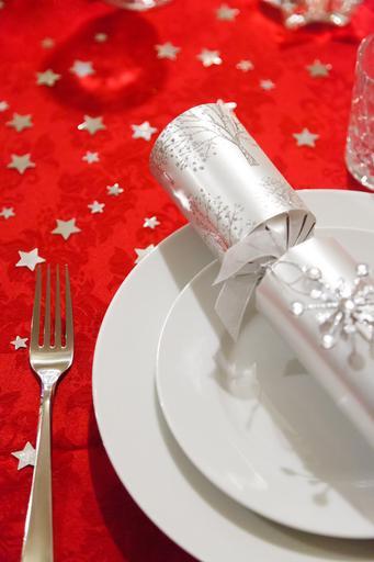 Keywords: celebration christmas decoration dining dinner dish event festive fork holiday plate red season seasonal setting silver table xmas cracker