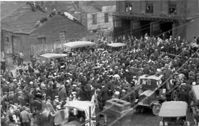 | Keywords: blackandwhite monochrome people crowd black and white Large crowd of people standing in the street, trucks are decoratedwith flags. There are a number of men sitting on a platform, possibly the back of a large truck in the upper right. There are spectators in the upper windows of a three bay garage on the right and on the roof of a building on the left. 508x308 Black and white Published by AZO Large crowd of people standing in the street, trucks are decoratedwith flags. There are a number of men sitting on a platform, possibly the back of a large truck in the upper right. There are spectators in the upper windows of a three bay garage on the right and on the roof of a building on the left. 508x308 Black and white Published by AZO |