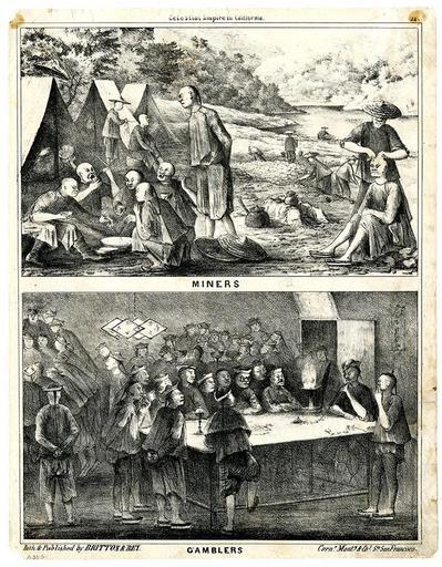 Keywords: chinese california miners lithograph photo border text drawing outdoor Repository: California Historical Society Digital object ID: Kemble Spec Col 09_B026 Call number: Kemble Spec Col 09 Collection: California Lettersheet Collection Date: Undated Physical Description: 2 lithographs; 12 x 19 cm. each. General Note: Lith. & Published by Britton & Rey. Cornr. Monty. & Cala. Sts. San Francisco. Preferred citation: Celestial empire in California. Miners [upper] Gamblers [lower], California Lettersheet Collection, Kemble Spec Col 09, courtesy, California Historical Society, Kemble Spec Col 09_B026. Online finding aid: www.oac.cdlib.org/findaid/ark:/13030/c8rx9dfv Repository: California Historical Society Digital object ID: Kemble Spec Col 09_B026 Call number: Kemble Spec Col 09 Collection: California Lettersheet Collection Date: Undated Physical Description: 2 lithographs; 12 x 19 cm. each. General Note: Lith. & Published by Britton & Rey. Cornr. Monty. & Cala. Sts. San Francisco. Preferred citation: Celestial empire in California. Miners [upper] Gamblers [lower], California Lettersheet Collection, Kemble Spec Col 09, courtesy, California Historical Society, Kemble Spec Col 09_B026. Online finding aid: www.oac.cdlib.org/findaid/ark:/13030/c8rx9dfv |
