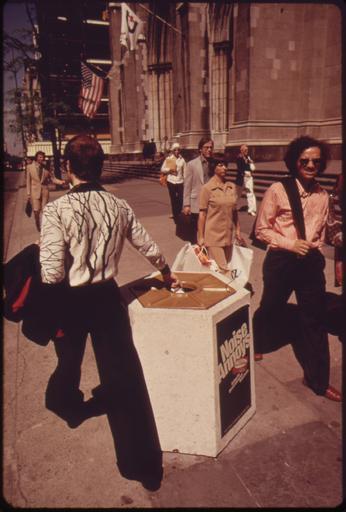 | Keywords: CEMENT LITTER BASKETS-A KEEP-NEW YORK-CLEAN INNOVATION ON FIFTH AVENUE. THE WEIGHT DISCOURAGES THEFT. SALE OF... - NARA - 549806.jpg Scope and content General notes 549806 Local identifier 412-DA-7321 Environmental Protection Agency 12/02/1970 - NARA-Author Miller Gary Photographer 8464459 <br /> New York New York state United States North and Central America inhabited place 4191644 40 7 -74 <br /> Still Picture Records Section Special Media Archives Services Division NWCS-S National Archives at College Park 8601 Adelphi Road College Park MD 20740-6001 05/1973 Record group Record Group 412 Records of the Environmental Protection Agency 1944 - 2006 Record group ARC 708 DOCUMERICA The Environmental Protection Agency's Program to Photographically Document Subjects of Environmental Concern compiled 1972 - 1977 Series ARC 542493 File unit File unit ARC Variant control numbers Agency-Assigned Identifier 123/01/007321<br /> NAIL Control Number NWDNS-412-DA-7321 Other versions <gallery> File CEMENT_LITTER_BASKETS-A_KEEP-NEW_YORK-CLEAN_INNOVATION_ON_FIFTH_AVENUE _THE_WEIGHT_DISCOURAGES_THEFT _SALE_OF _-_NARA_-_549806 tif tif File CEMENT_LITTER_BASKETS-A_KEEP-NEW_YORK-CLEAN_INNOVATION_ON_FIFTH_AVENUE _THE_WEIGHT_DISCOURAGES_THEFT _SALE_OF _-_NARA_-_549806 jpg jpg </gallery> NARA-cooperation PD-USGov 1973 in New York City Trash cans in the United States |