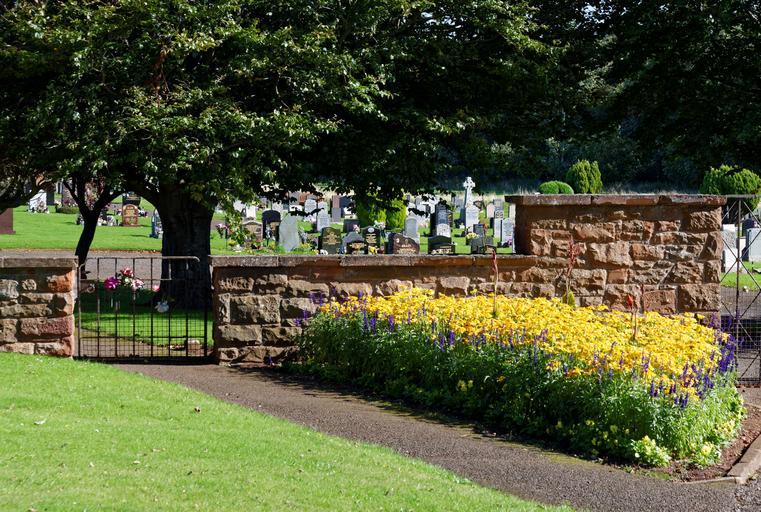 Keywords: cemetery entrance gates cemetery trees headstones graves graveyard memorials stone tombstone burial gravestone grief marble peace autumn