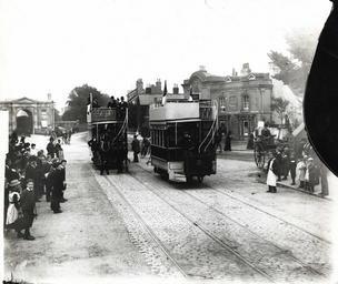 | Keywords: Cemetery Junction, 15 July 1893.jpg en Reading Tramways Company Horse-trams 2 and 3 at the Cemetery Junction terminus 15 July 1893 This is the first day of operation for the double-deck cars and a crowd of onlookers has gathered Car No 2 carries advertising for Edwin Awmack's hardware shop at 87 Broad Street Car No 3 is waiting for the horses to be changed Between the cars is a Starley Royal Salvo tricycle with two very large wheels In the background are the cemetery gates the shop of the Reading Dairy Company at No 12 Wokingham Road and the Marquis of Granby inn in London Road 1890-1899 photograph by Walton Adams 1893-07-15 http //readingimages epixtech co uk/extra/test3 html Reading Borough Libraries Creator Walton Adams PD-old-70 Cemetery Junction Reading Transport Horse trams in the United Kingdom Reading in the 1890s 1893 in England 1893 photographs Walton Adams Reading Tramways Company 1893 in rail transport in the United Kingdom |