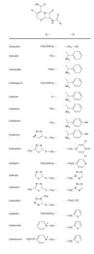 Keywords: Cephalosporins Generation1.svg List of structural formulas of the so called 'cephalosporins/cefalosporins of the first generation' No font is used but latin glyphs are as is usual in chemistry Usage of a font would have made the file half as big but identical and good look on all systems would have been impossible the author Cephalosporin antibiotics |