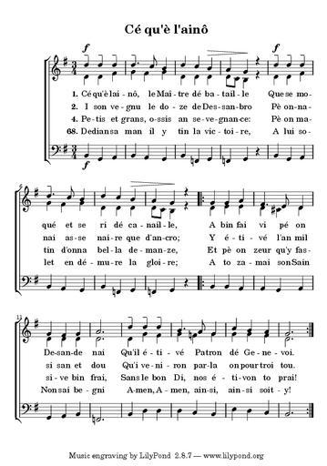 | Keywords: Cequelaino.png Music and lyrics of the w fr Cé qu'è lainô the offical anthem of Geneva Music of the w fr Cé qu'è lainô; lyrics for the four stanzas usually sung are also included Typeset by User Schutz using w en Lilypond Original version around 1603; typeset in January 2007 Author The original lyrics and music are in the public domain due to their age musical notation LilyPond source <pre> Cé qu'è l'ainô \header title Cé qu'è l'ainô \paper line-width 15\cm paper-width 17\cm paper-height 25\cm top-margin 0\cm bottom-margin 0 5\cm left-margin 1\cm right-margin 1\cm \relative \time 3/4 \new ChoirStaff << \new Staff << \key g \major \new Voice main \voiceOne \dynamicUp \key g \major d'--\f d-- d-- d4 -- c8 b4 d c b\> a g\ r d'--\f d-- d-- d4 -- c8 b4 d c b\> a g\ r \repeat volta 2 g g a fis4 e8 d4 g4 fis g a2 d4-- d-- d-- b4 a8 g4 c b a g2 \new Voice second \voiceTwo \key g \major d4 d fis g fis g d d d d8 c b4 r d d fis g fis g d d d d8 c b4 r d e e d cis d d d d d2 d4 g fis g f g g g fis d2 >> \new Lyrics \lyricsto main \set stanza 1 Cé qu'è lai -- nô le Maî -- tre dé ba -- tail -- le Que se mo -- qué et se ri dé ca -- nail -- le A bin fai vi pé on De -- san -- de nai Qu'il é -- ti -- vé Pa -- tron dé Ge -- ne -- voi \new Lyrics \lyricsto main \set stanza 2 I son ve -- gnu le do -- ze de Des -- san -- bro Pè on -- na -- nai as -- se nai -- re que d'an -- cro; Y é -- ti -- vé l'an mil si san et dou Qu'i ve -- ni -- ron par -- la on pour troi tou \new Lyrics \lyricsto main \set stanza 4 Pe -- tis et grans o -- ssis an se -- ve -- gnan -- ce Pè on ma -- tin d'on -- na bel -- la de -- man -- ze Et pè on zeur qu'y fas -- si -- ve bin frai Sans le bon Di nos é -- ti -- von to prai \new Lyrics \lyricsto main \set stanza 68 De -- dian sa man il y tin la vic -- toi -- re A lui so -- let en dé -- mu -- re la gloi -- re; A to za -- mai son Sain Non sai be -- gni A -- men A -- men ain -- si ain -- si soit -- y \new Staff << \clef bass \key g \major \new Voice b 4 \f g a b a g b f g f g r b g a b a g b f g f g r b b a a g a g a b f2 b4 d d d c b e d c b2 >> >> \version 2 8 7 </pre> PD-old L'Escalade Franco-Provençal language Images with LilyPond source code |