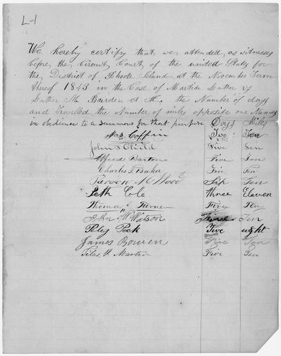 Keywords: Certification of attendance of witnesses for the US Circuit Court in the case of Martin Luther v. Luther Borden, et. al. - NARA - 278283.tif Scope and content This document is from the file for the case of Martin Luther v Luther Borden This is a suit for trespass against a group of Rhode Island state militia who acting under martial law broke into Martin Luther's house in the middle of the night searched the premises and threatened its inhabitants Luther claimed that the legislation establishing martial law was void because the charter government which proclaimed martial law was not the legal government of Rhode Island The defendents claimed that the declaration of martial law was legal and that they were acting under the orders of their superior officers when they entered the house to search for Luther who was an important supporter of Thomas W Dorr who had organized a people's government The decision of the US Circuit Court in favor of the defendents was appealed to the US Supreme Court The US Supreme Court however feeling that the case was political in nature refused to rule on the issues and returned the case to the US Circuit Court This case was an important case in the historic events commonly known as the Dorr Thomas W Dorr Rebellion General notes 278283 Local identifier U S Circuit Court for the District of Rhode Island 1790 - 01/01/1912 NARA's Northeast Region Boston NRAAB 380 Trapelo Road Waltham MA 02452-6399 ca 11/1843 - ca 11/1843 Record group Record Group 21 Records of District Courts of the United States 1685 - 2004 Record group ARC 350 Case Files compiled 11/1790 - 12/1911 Series ARC 278236 File unit Martin Luther v Luther Borden et al 10/06/1842 - 12/1848 File unit ARC 278271 Variant control numbers NAIL Control Number NRAB-21-CASECCRI-24LAW-L yes Other versions NARA-cooperation PD-USGov Luther v Borden |