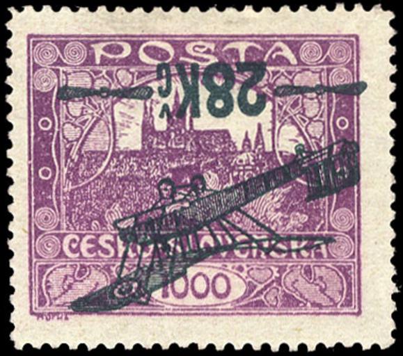 Keywords: Ceskoslovensko1920hradcany1000airmail28invert.jpg First postage stamp of Czechoslovakia Hradčany of Prague 1000 haléřů airmail overprint 28Kc inverted 1920 Пе вая почтовая ма ка Чехословакии п ажские Г адчаны 1000 хале ов пе евё нутая надпечатка авиапочты 28 к он 1920 own collection 1920 creator Alfons Mucha PD-Old 1920 stamps Hradcany issue Airmail stamps Stamps with inverted overprint |