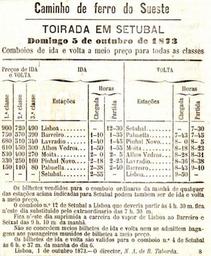Keywords: CFS Setubal bullfighting advertisement 2.jpg pt Anúncio do Caminho de Ferro do Sueste em Portugal para comboios especiais a preços reduzidos de Lisboa via fluvial até ao Barreiro até Setúbal para uma tourada Esta imagem foi publicada no Diario Illustrado n º 418 de 2 de Outubro de 1873 e digitalizada pela Biblioteca Nacional de Portugal en Advertisement of the Caminho de Ferro do Sueste Portuguese Southeastern Railway for special trains at reduced prices from Lisbon boats to Barreiro to Setúbal for a bullfighting event This image was published on the Diario Illustrado newspaper No 418 of 2nd October 1873 and scanned by the Biblioteca Nacional de Portugal 1873-10-01 http //purl pt/14328/1/j-1244-g_1873-10-02/j-1244-g_1873-10-02_item2/j-1244-g_1873-10-02_PDF/j-1244-g_1873-10-02_PDF_24-C-R0150/j-1244-g_1873-10-02_0000_1-4_t24-C-R0150 pdf Caminho de Ferro do Sueste other versions Institution Institution Biblioteca Nacional de Portugal Custom license marker 2015 08 24 Anonymous-EU Public transport information in Portugal Caminho de Ferro do Sueste 1873 in rail transport in Portugal Ferries in Lisbon Linha do Alentejo Linha do Sul Images from the Biblioteca Nacional de Portugal |