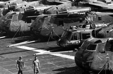 Keywords: CH-53s and UH-1E on USS Hancock (CVA-19) 1975.jpg U S Marine Corps Sikorsky CH-53 Sea Stallions of Heavy Marine Helicopter Squadron HMH-463 and a Bell UH-1E Huey from Marine Light Helicopter Squadron HML-367 aboard the U S Navy aircraft carrier USS Hancock CVA-19 in April-May 1975 Hancock embarked HMH-463 and part of HML-367 to take part in operations Eagle Pull and Frequent Wind Most of her regular air group had been flown to Subic Bay Philippines U S Navy photo http //www navysite de/cruisebooks/cv19-75/040 htm from the http //www navysite de/cruisebooks/cv19-75/index_004 htm USS Hancock CVA-19 1975 cruise book available at http //navysite de/cruisebooks/index html Navysite de 1975 USN PD-USGov-Military-Navy Aboard USS Hancock CV-19 Operation Frequent Wind Marine Heavy Helicopter Squadron 463 Sikorsky CH-53A/D Sea Stallion U S Marine Corps Bell UH-1 Iroquois in the Vietnam War Marine Light Attack Helicopter Squadron 367 |