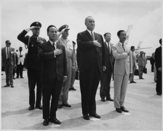 Keywords: Chairman Nguyen Van Thieu, President Lyndon B. Johnson and Prime Minister Nguyen Cau Ky salute during the playing of the - NARA - 542079.tif Local identifier 306-SSM-8K 2 U S Information Agency Press and Publications Service ca 1953 - ca 1978 Still Picture Records Section Special Media Archives Services Division NWCS-S National Archives at College Park 8601 Adelphi Road College Park MD 20740-6001 1961 - 1974 Record group Record Group 306 Records of the U S Information Agency 1900 - 2003 Record group ARC 622 Miscellaneous Subjects Staff and Stringer Photographs compiled 1961 - 1974 Series ARC 541992 Variant control numbers NAIL Control Number NWDNS-306-SSM-8K 2 General notes Use War and Conflict Number 388 when ordering a reproduction or requesting information about this image Scope and content File unit File unit ARC yes Other versions Image extracted File Nguyen Cao Ky 1967 jpg NARA-cooperation PD-USGov Lyndon B Johnson Nguyen Van Thieu Nguyen Cao Ky Antonio B Won Pat International Airport Salutes |