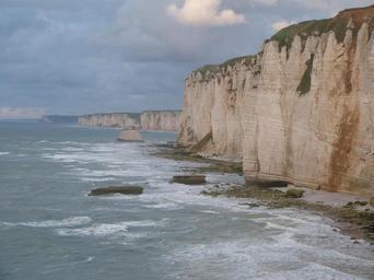 Keywords: etretat cliff ocean view cape mountain sea hill pebble coast arch brittany stone france nautical natural perspective travel rock rocky panoramic horizon elephant formation village chalk alabaster magma tide normandy