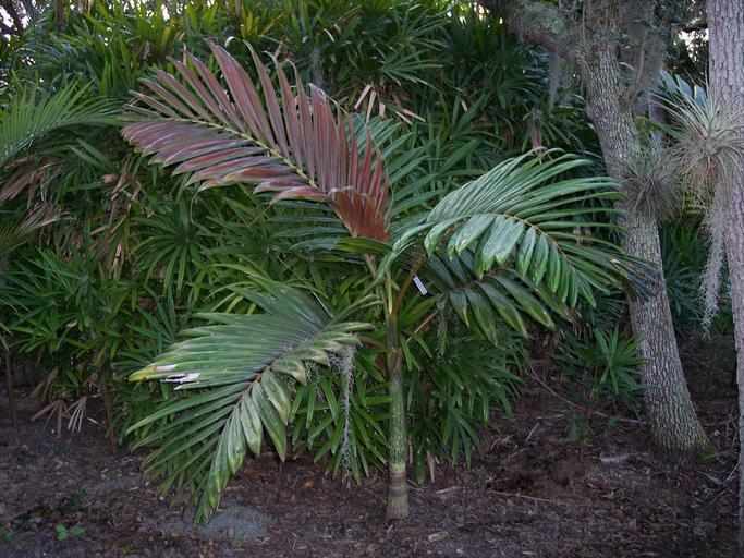 Keywords: Chambeyroniamacrocarpatrunkandcrown.JPG en A young Chambeyronia macrocarpa with colored new foliage own Mmcknight4 2008-11-15 Chambeyronia macrocarpa