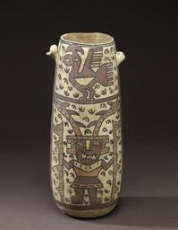 Keywords: Chancay - Vessel - Walters 20092035.jpg The Chancay art style dominated Peru's Central Coast during the Late Intermediate Period although there was no centralized overarching state authority ruling the region Textiles and pottery were the primary artistic media the former being among the most colorful visually complex and technically excellent weavings ever produced in Peru Chancay pottery on the other hand is often rather casually or carelessly painted its slip characterized by a matte surface finish and a palette restricted to white and black with the infrequent addition of red or beige The low-fired Chancay ceramics make them susceptible to surface damage unlike the earlier pottery of the Moche Nasca and Waricultures On the other hand Chancay painting can be as lively as that of any Andean tradition The acute difference in quality between Chancay ceramics and textiles reflects sociopolitical divisions in Chancay culture Burial patterns indicate that the painted ceramics were consumed by all levels of Chancay society whereas fine textiles and precious metal objects were restricted to members of higher status As elsewhere in the Andean world artistic quality and materials conveyed messages of hierarchy and power This tall narrow vessel features the frontal rendering of a male figure He grasps a puma-headed staff in each hand and two serpent-headed rays emanate from his head These pan-Andean features link the figure to traditional depictions of supernatural beings or deities and shamans The bird painted at the top of the vessel reflects this theme in its crescent-shaped head adornment which distinguishes the Sicán Deity or Sicán Lord who may be a culture hero or a deity among cultures to the north The Sicán Lord is associated primarily with the Sicán and later Chimú societies of the North Coast although the Chimú extended their influence over the Chancay people at the end of the Late Intermediate Period It is not improbable that this symbol of divinity and/or sacred ancestry was adopted by the Chancay The painter of this tall vessel animated the scene by filling the background with black avian footprints which at the least lend motion to the bird if not implying its ritual performance AD 1000-1470 Late Intermediate earthenware slip paint cm 29 69 12 19 accession number 2009 20 35 80190 Economos Works of Art date and mode of acquisition unknown John G Bourne 1990s by purchase Walters Art Museum Gift of John Bourne 2009 place of origin Central Coast Walters Art Museum license Pre-Columbian art in the Walters Art Museum Chancay pottery Media contributed by the Walters Art Museum needs category review Lambayeque pottery Staff God |
