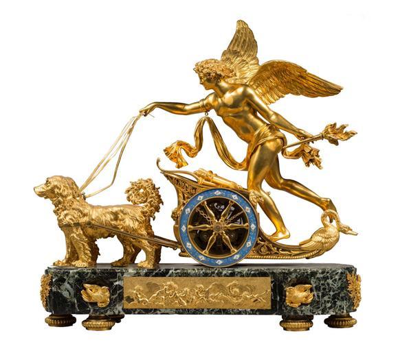 | Keywords: Chariot clock, Love Led by Fidelity, early 19th century.png en The chapter ring is enamelled in sky blue colour with white 12 lozenge cartouches for the numerals revealing the movement and indicates the hour in Arabic numerals by means of a pair of pierced gilt brass hands Finely chased ormolu bronze chariot which terminates in a swan neck driven by a standing winged Cupid with flowing draperies who holds a flaming torch in one hand and the reins in the other His attributes “ the bow and quiver “ are placed before him The chariot is drawn by two spaniels whose placid attitude contrasts with the dynamic pose of the god of love The oblong green marble base is lavishly decorated with ormolu bronze mounts including a low-relief frieze in the style of Clodion and leaf wreaths The base is raised on six gadrooned feet France First Empire period Own archive Case attributed to AndrĂ©-Antoine Ravrio 1759 Paris “ 4 October 1814 Paris Enamelled dial attributed to Etienne Gobin 1731-1815 known as Dubuisson 1806 1810 Chariot clock PD-old-100 |