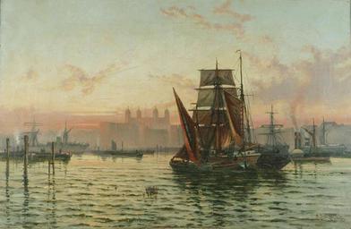 Keywords: Charles James De Lacy - Shipping on the Thames at dusk (1883).jpg Artwork Creator Charles James De Lacey 1883 oil on canvas cm 52 76 3 object history credit line accession number http //www bonhams com/auctions/11161/lot/171/ Bonhams PD-old-auto-1923 1936 Charles John De Lacy Paintings of the Thames Images from Bonhams |