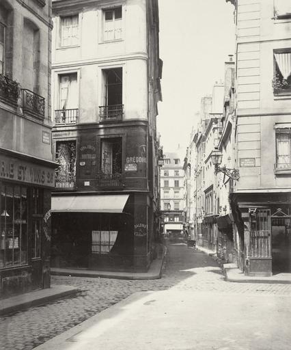 MAKE A MEME View Large Image Charles Marville, Rue Grégoire de Tours, de la rue de l'Ecole de Médecine, ca. 1853–70.jpg Looking from intersection of streets down cobbled laneway doorways opening onto narrow path Two plaques on corner buildings reading Rue de ...