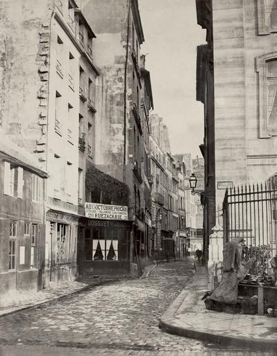 Keywords: Charles Marville, Rue Saint-Christophe, ca. 1853–70.jpg Photograph en Looking along cobbled street from intersection branching off on right plaque on corner wall Rue de la Cité; plates and pots stacked on wooden tressel on path railing fence behind shop front with shattered windows on left rue de la Cité plaque de rue ; au premier plan à droite sur le trottoir établi avec assiettes et pots devant une grille métallique; à gauche en enfilade maison de deux niveaux les fenêtres du deuxième munis de volets; maison de quatre niveaux en dessous de la gouttière un niveau au-dessus vitrines du rez-de-chaussée brisées inscription en lettres capitales Magasin de Limaille de Fer Bossuet Taillandier en minuscules ci-Devant Rue ; échoppe de deux niveaux construite dans l'angle formé avec le mur pignon saillant de la première des maisons suivantes avec verrière à petit carreaux munis de rideaux surmontée de l'inscription Bossuet Taillandier un panneau accroché au niveau supérieure indique Au 15 octobre prochain l'Atellier sic de Taillanderie sera transferé No 20 rue Zacarie No 20 rue Zacharie actuelle rue Xavier-Privas Au fond Café Estaminet et panneaux publicitaires - La rue Saint-Christophe commençait rue de la Cité anciennes rues de la Juiverie et du Marché-Palu et finissait place du Parvis-Notre Dame <ref>Jean La Tynna Dictionnaire topographique étymologique et historique des rues de Paris 1812 </ref> depicted people depicted place Paris France circa 1853 “70 1 photographic print mounted on cardboard albumen silver 34 x 26 7 cm Institution State Library of Victoria object history exhibition history credit line Gift; Government of France; 1880 Unsigned but Charles Marville Undated dates assigned from time of Haussman's renovation of Paris Title hand inscribed beneath image on paper pasted to portfolio page accession number H88 19/62 SLVIC-digitalimage 116507 H88 19/62 <gallery> File Hôtel-Dieu sur le plan de Turgot jpg ancienne rue Saint-Christophe en la Cité sur le plan Turgot 1739 File Plan de la Cité de Paris - 1862 - Ferdinand Heuzey jpg sur le plan de Ferdinand Heuzey 1862 </gallery> PD-100 Historical images of ÃŽle de la Cité Former streets of ÃŽle de la Cité Saint-Christophe Blacksmiths from France Rue de la Cité Paris Charles Marville - Photographic views of Paris Images of Paris from the State Library of Victoria |
