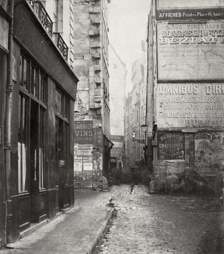| Keywords: Charles Marville, Rue Tirechape, de la rue de Rivoli, ca. 1853–70.jpg Photograph en Looking along narrow cobbled street with wine shop and path on left buildings on intersecting street with advertising painted on wall lamp over doorway with the word Hotel carriage in narrow lane depicted people depicted place A former street in Paris France circa 1853 “70 photographic print mounted on cardboard albumen silver 30 7 x 27 cm Institution State Library of Victoria accession number H88 19/81 SLVIC-digitalimage 122742 H88 19/81 object history exhibition history credit line Gift; Government of France; 1880 Photographer unknown but probably Charles Marville Undated dates assigned from time of Haussman's renovation of Paris Title hand inscribed on label adhered to portfolio page beneath image Information field In collection Photographic views of Paris PD-100 Charles Marville - Photographic views of Paris Images of Paris from the State Library of Victoria Rue Tirechape Paris Advertising in Paris |
